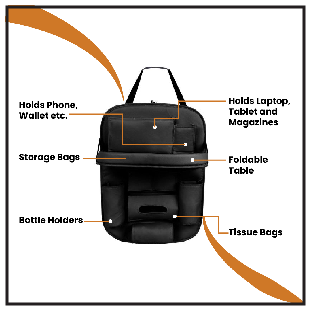 CONVENIENT ORGANIZATION: Designed to give you a place for everything, this auto backseat organizer is great to keep your car organized and keep your seat clean/protected. Our unique design allows you to have a portable organizer that won't take a lot of space and a variety of pockets to keep everything that you need in one place.
