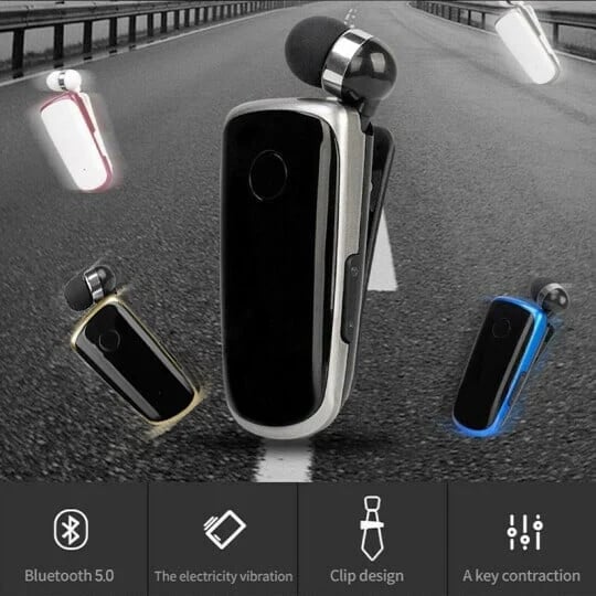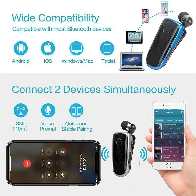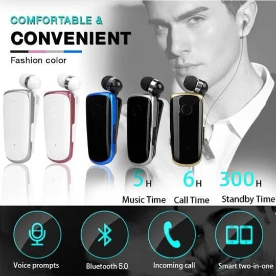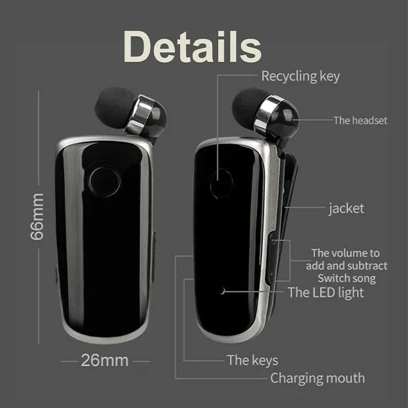 Retractable Bluetooth Headset with Clip-on design, you can clip on the collar, tie, or shoulders. Also, when you no need the earbuds, just retracted the earbud. Release the pressure on the ear. Real comfortable Bluetooth headset for your right or Real comfortable Bluetooth headset for your right or left nearside.