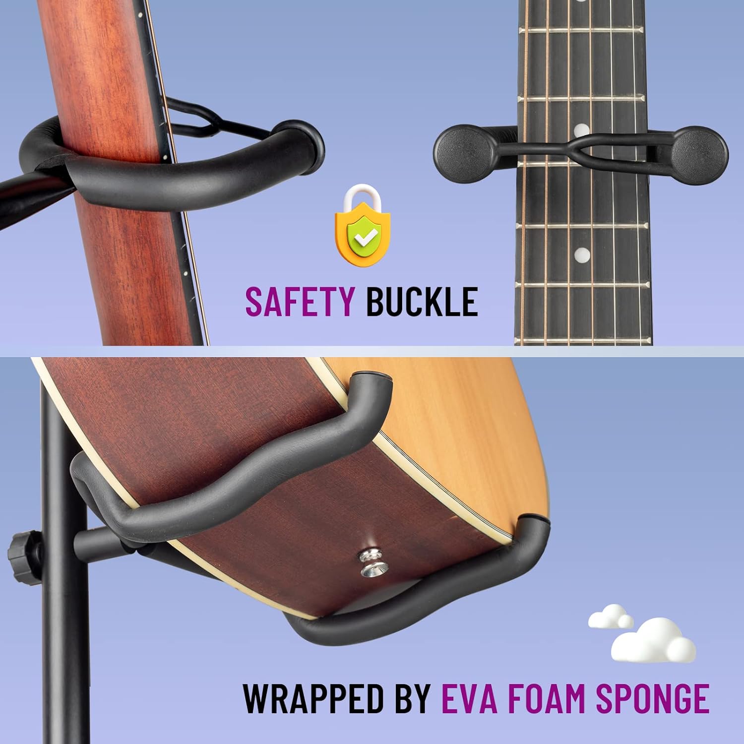 - Universal Guitar Stand: The cradle is fixed to the guitar stand with a knob. Suitable for various types of guitars such as acoustic, electric guitars, bass, 6 and 12 string guitars, banjo, mandolin, etc. In addition, the cradle is high off the ground, especially for accommodate non-symmetrical body guitars. Every great guitar deserves the best guitar stand!