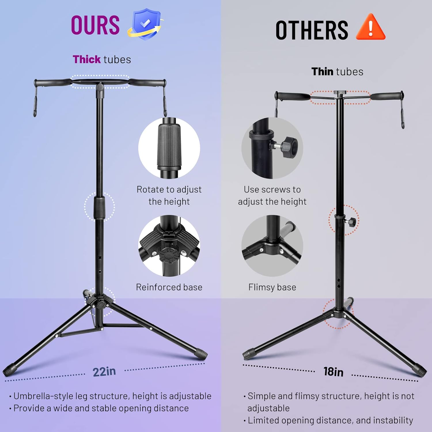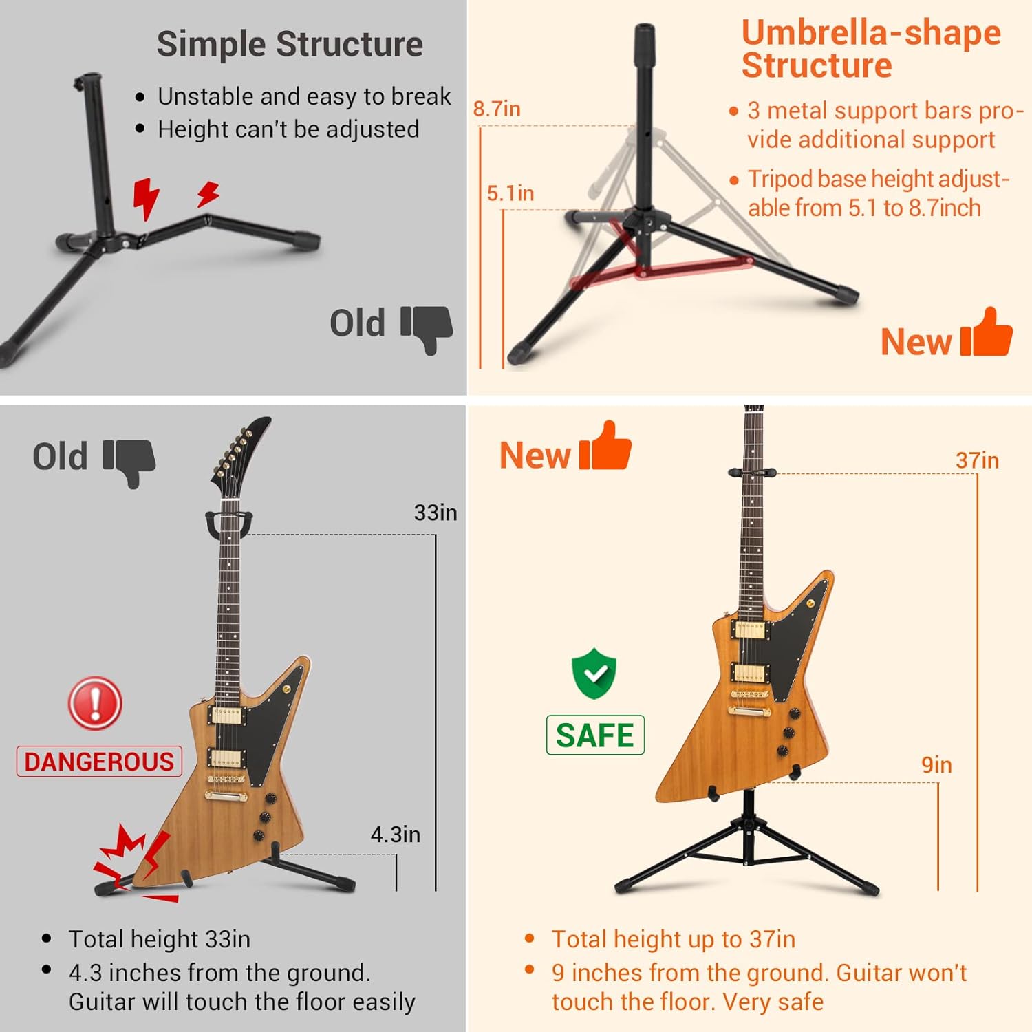 - Umbrella-Shape Structure Sturdy Base: We add three thick metal support bars to the base to provide additional support for the entire electric guitar stand. Tripod legs extend farther outwards for a steadier footing. Anti-slip rubber feet to hold a firm grip on the floor. Once the bass guitar stand is installed and put the guitar in place, it will be very stable and has no chance of falling over. The height of the base is adjustable from 5.1-8.7inch.