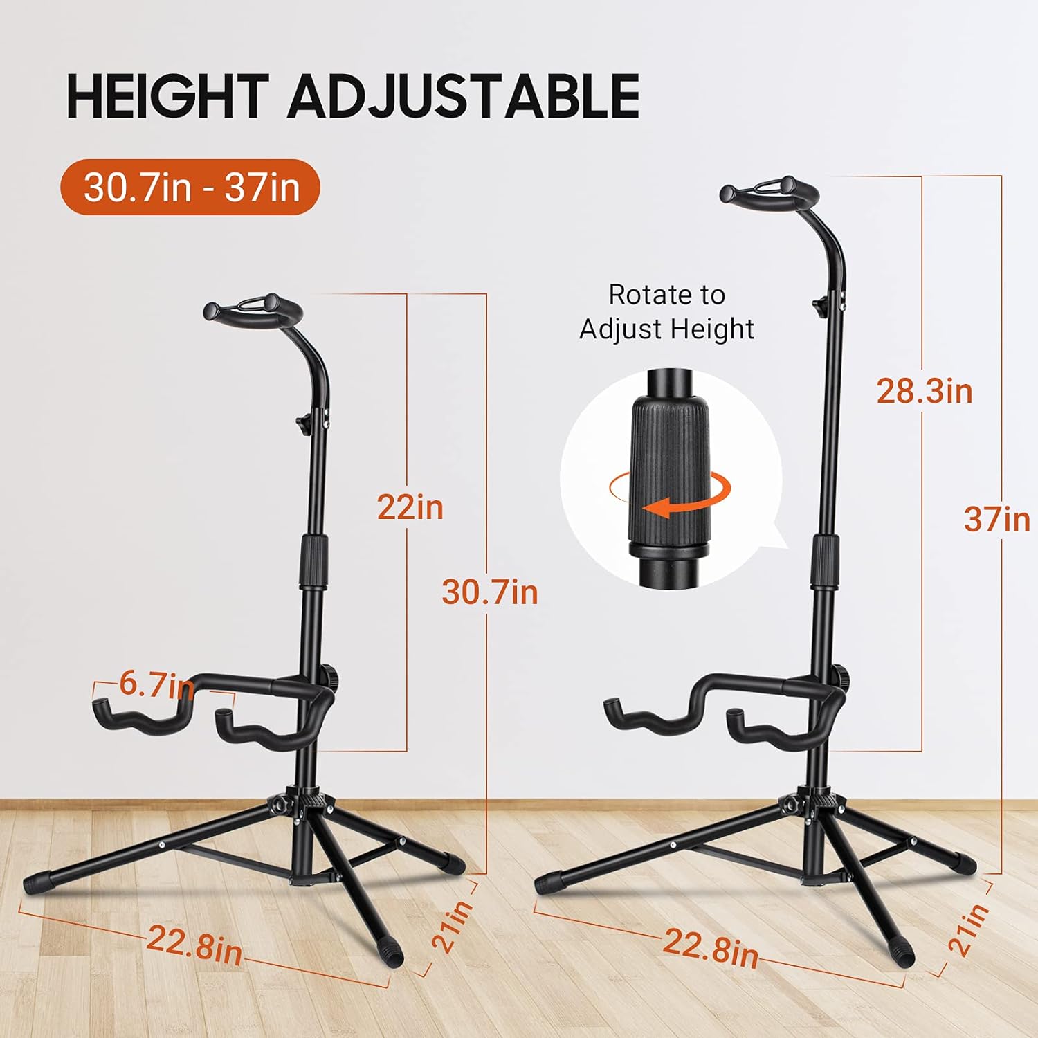 - Rotate to Adjust Height: The biggest difference from the conventional guitar stands is that this acoustic floor guitar stand can be rotated to adjust the height from 30.7 inches to 37 inches. Very easy to use and accommodate different models of guitars.