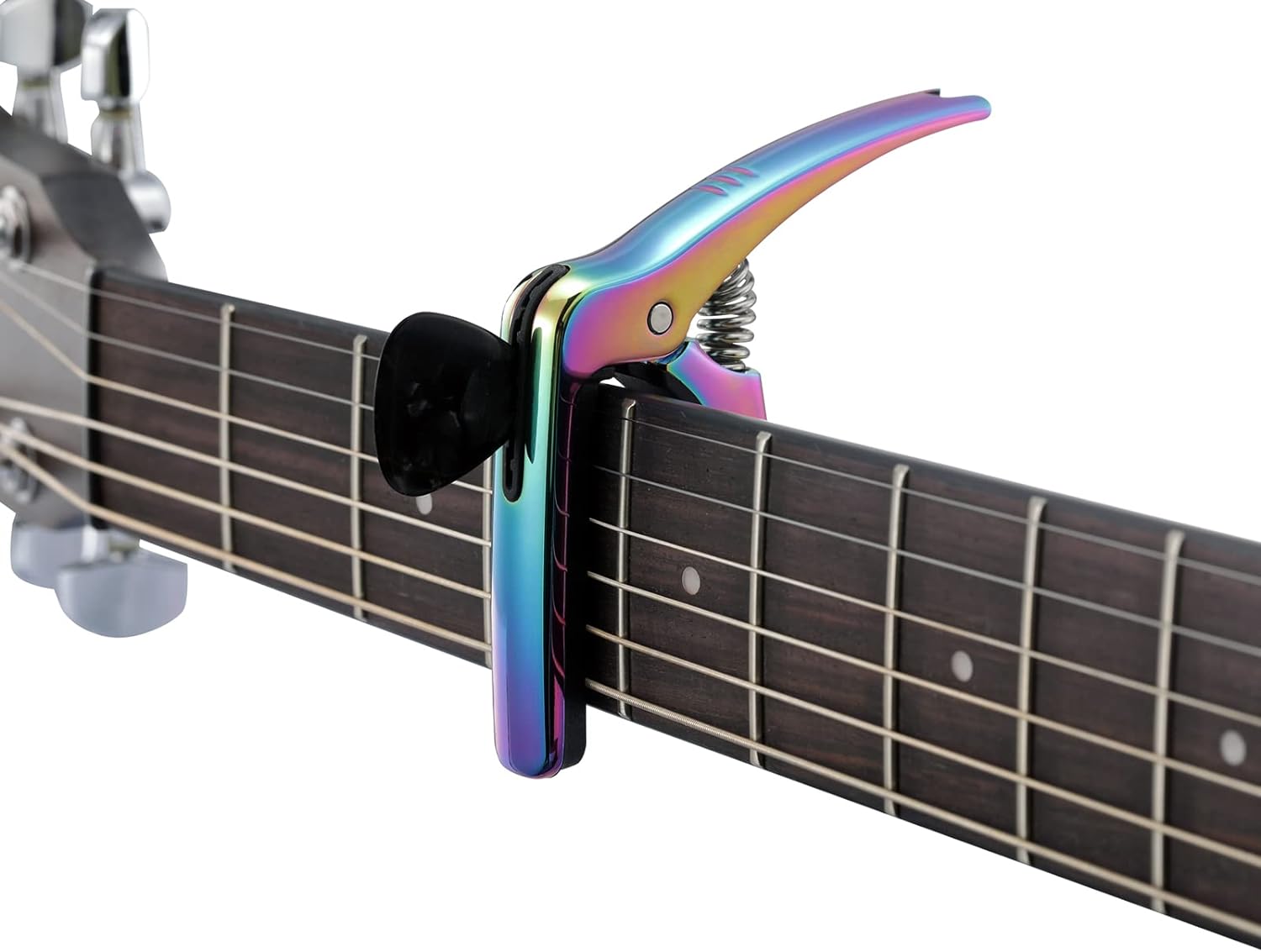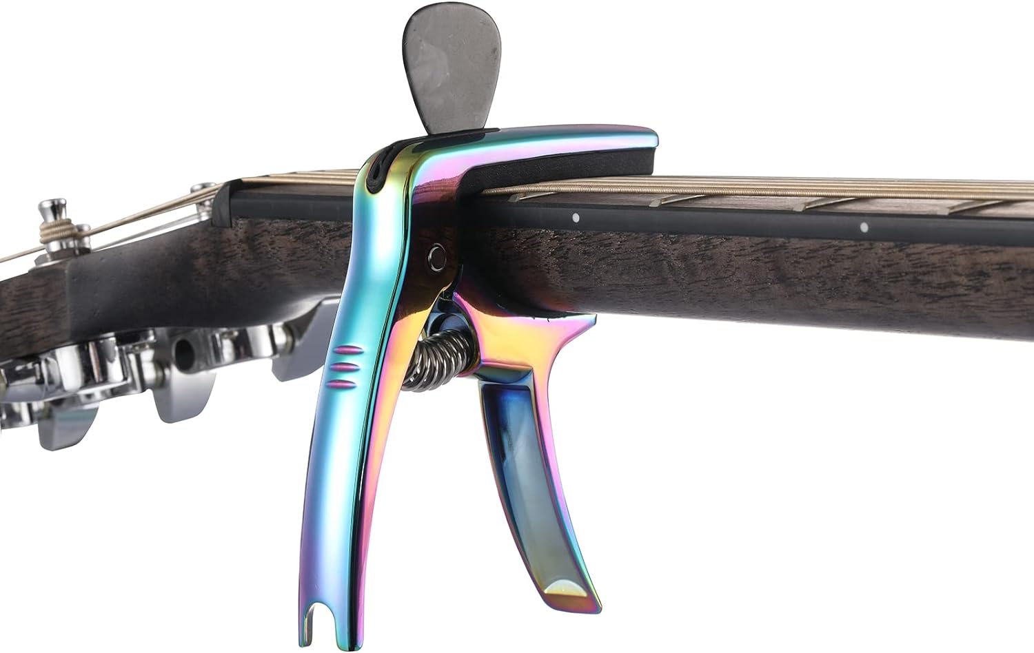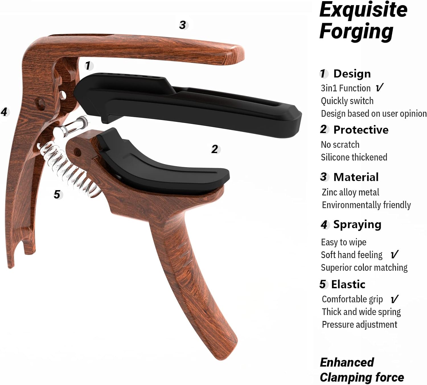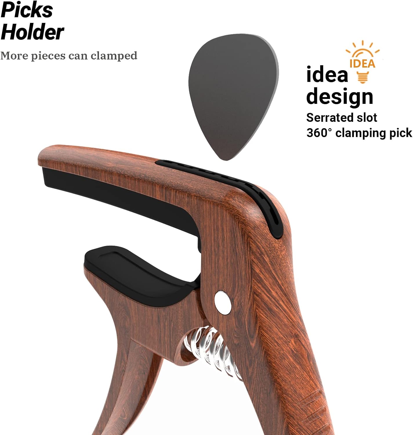 - CREATIVE 3IN1:Includes capo& guitar pin puller,equipped with arc multi-piece pick holder,support carry 360°clamping pick,won't shake off