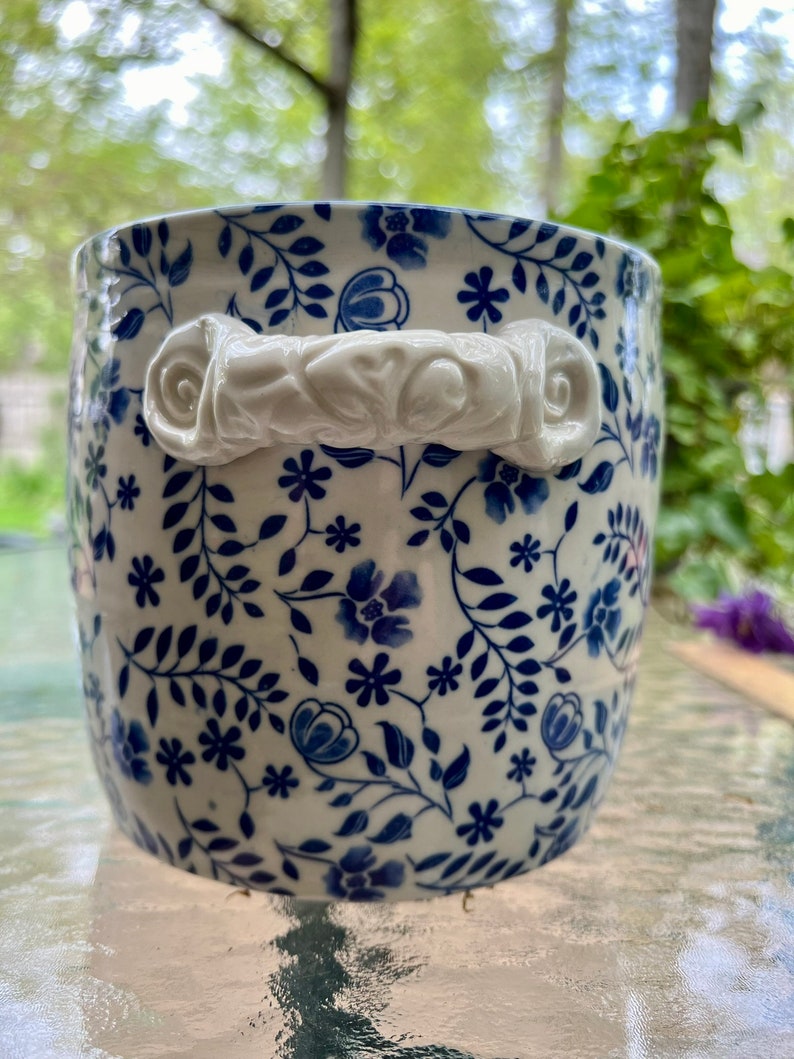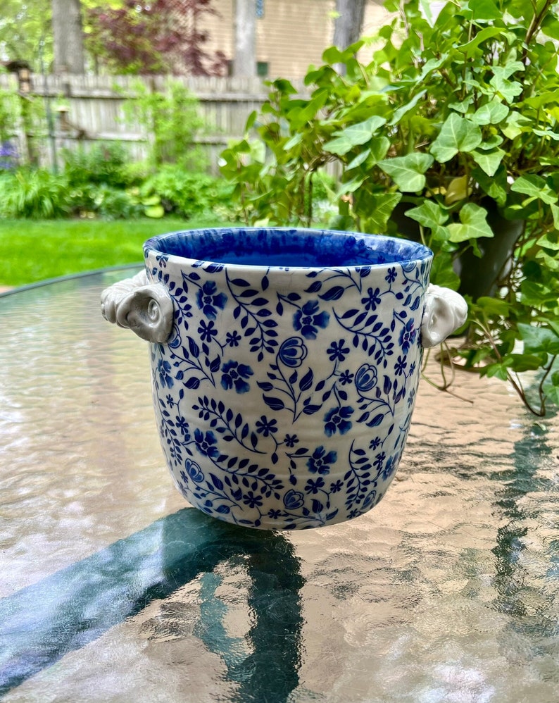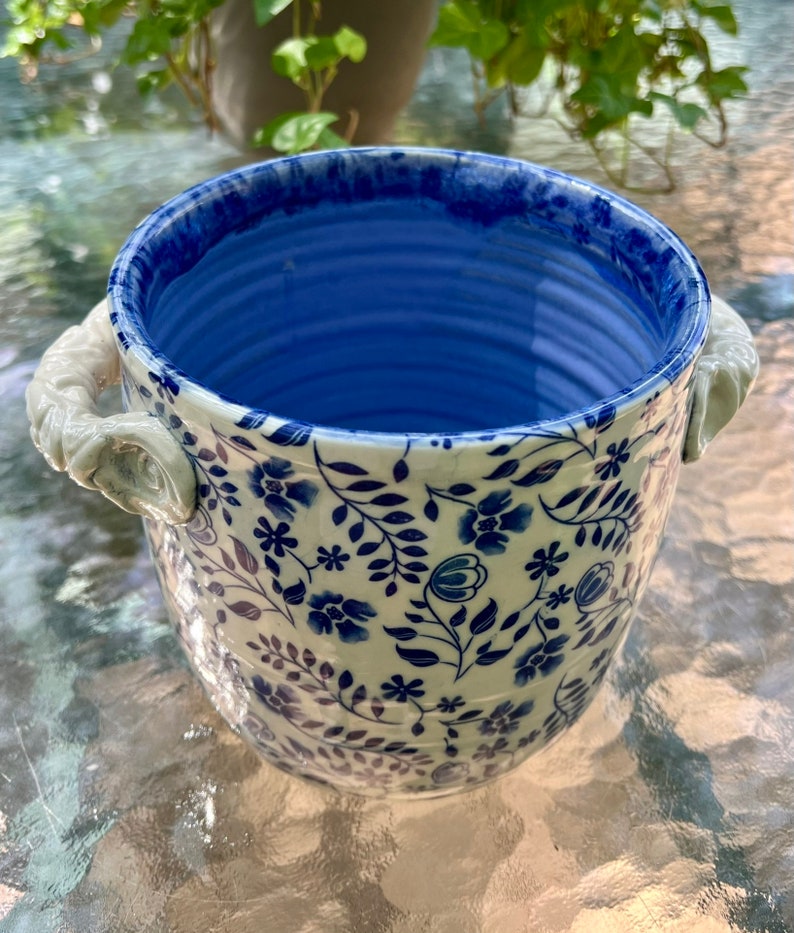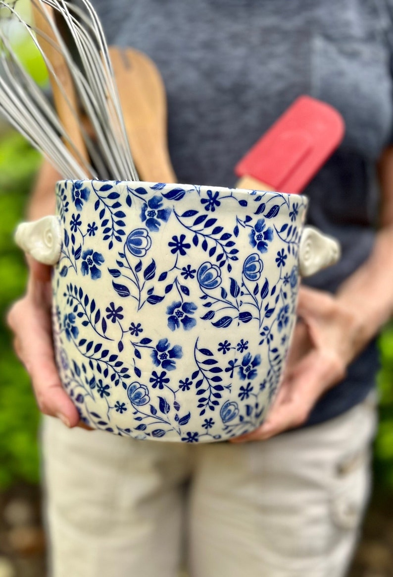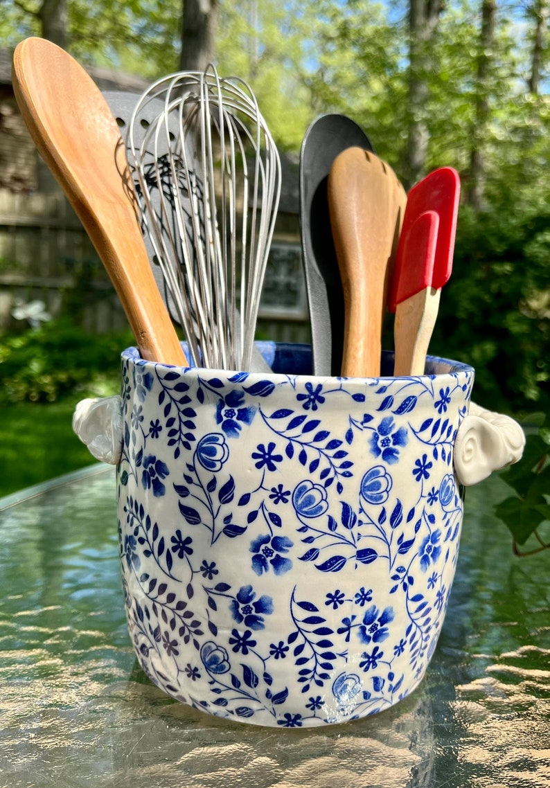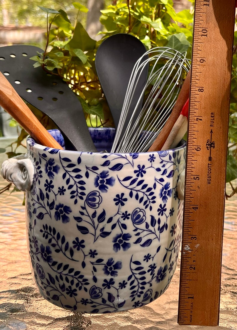 This utensil holder was thrown on the potters wheel with porcelain clay. The underglaze pattern was then applied and the handles were formed and put on. After it was dry it was bisque fired. After the firing a clear glaze was applied and then the piece was again fired this time to 2232 degrees. I make all my own lead-free and food safe glazes.