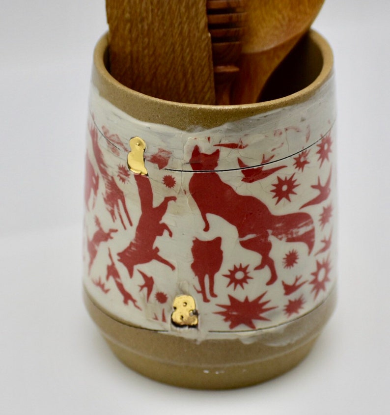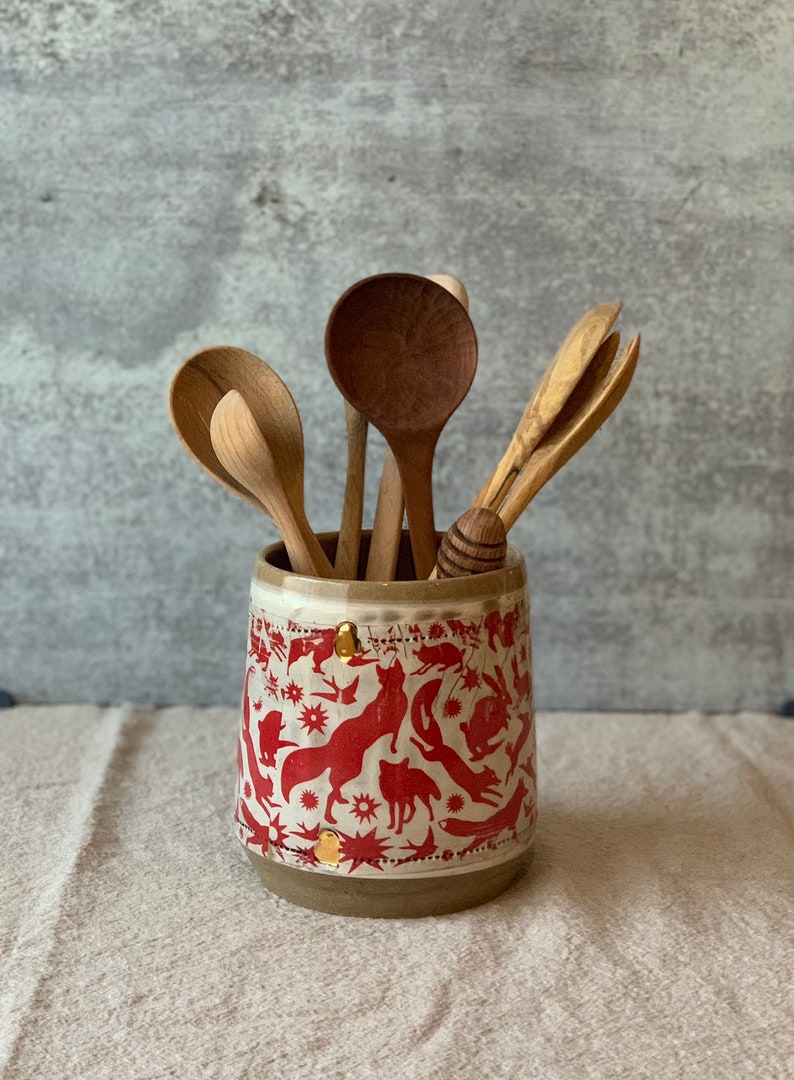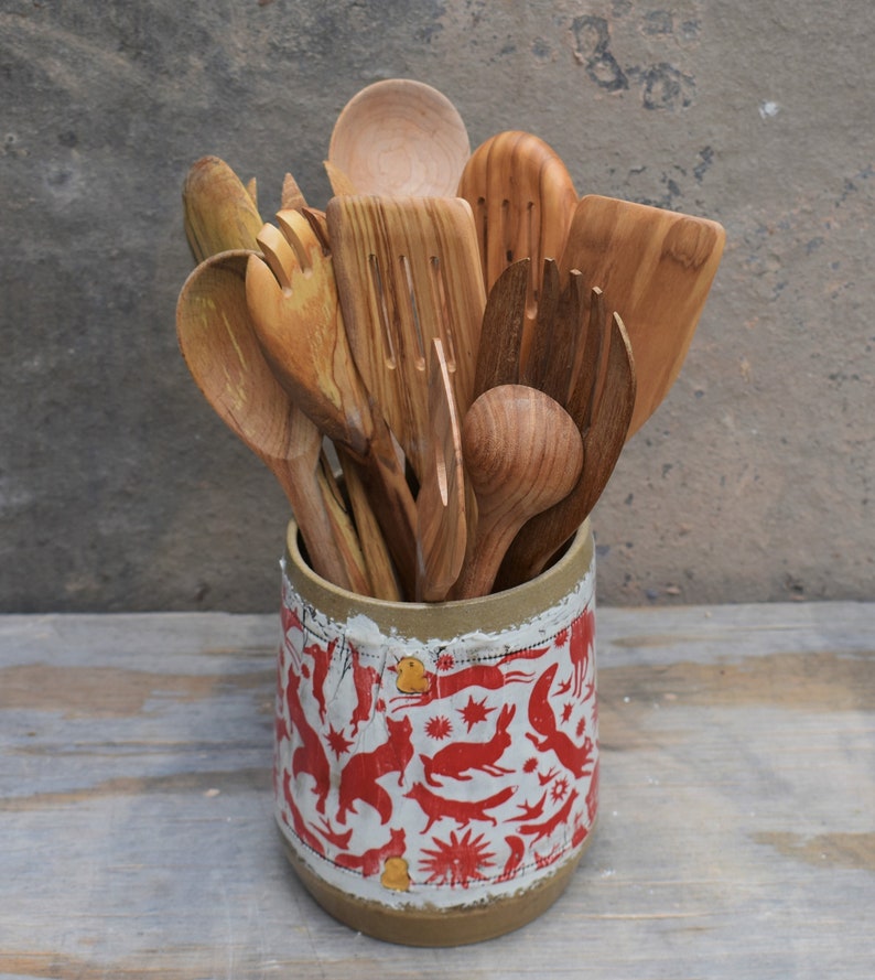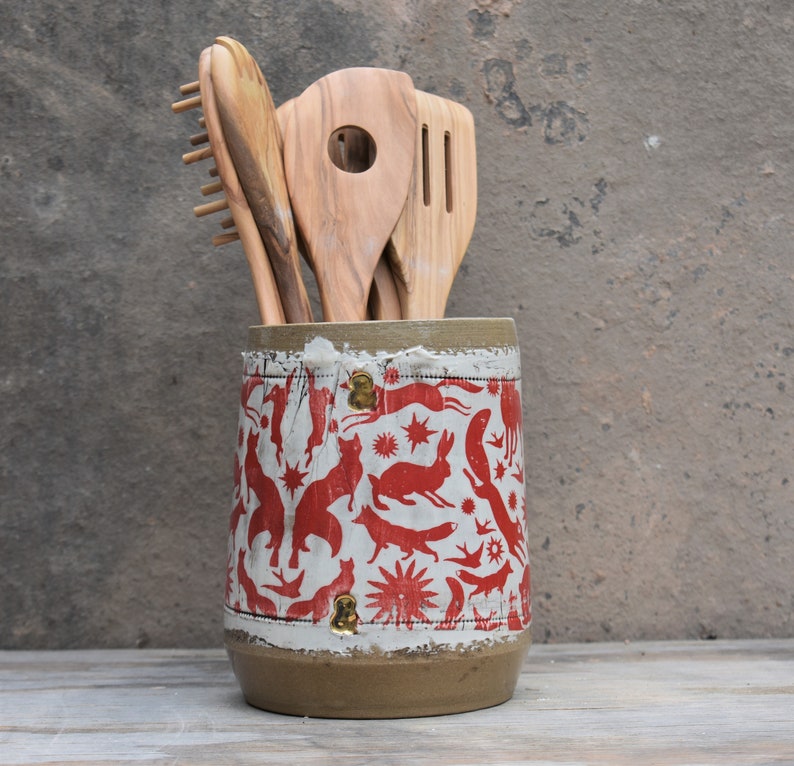 unique one of a kind kitchen utensil holder . It was handmade on my potters wheel from stoneware clay. glazed in a glossy roasted almonds .