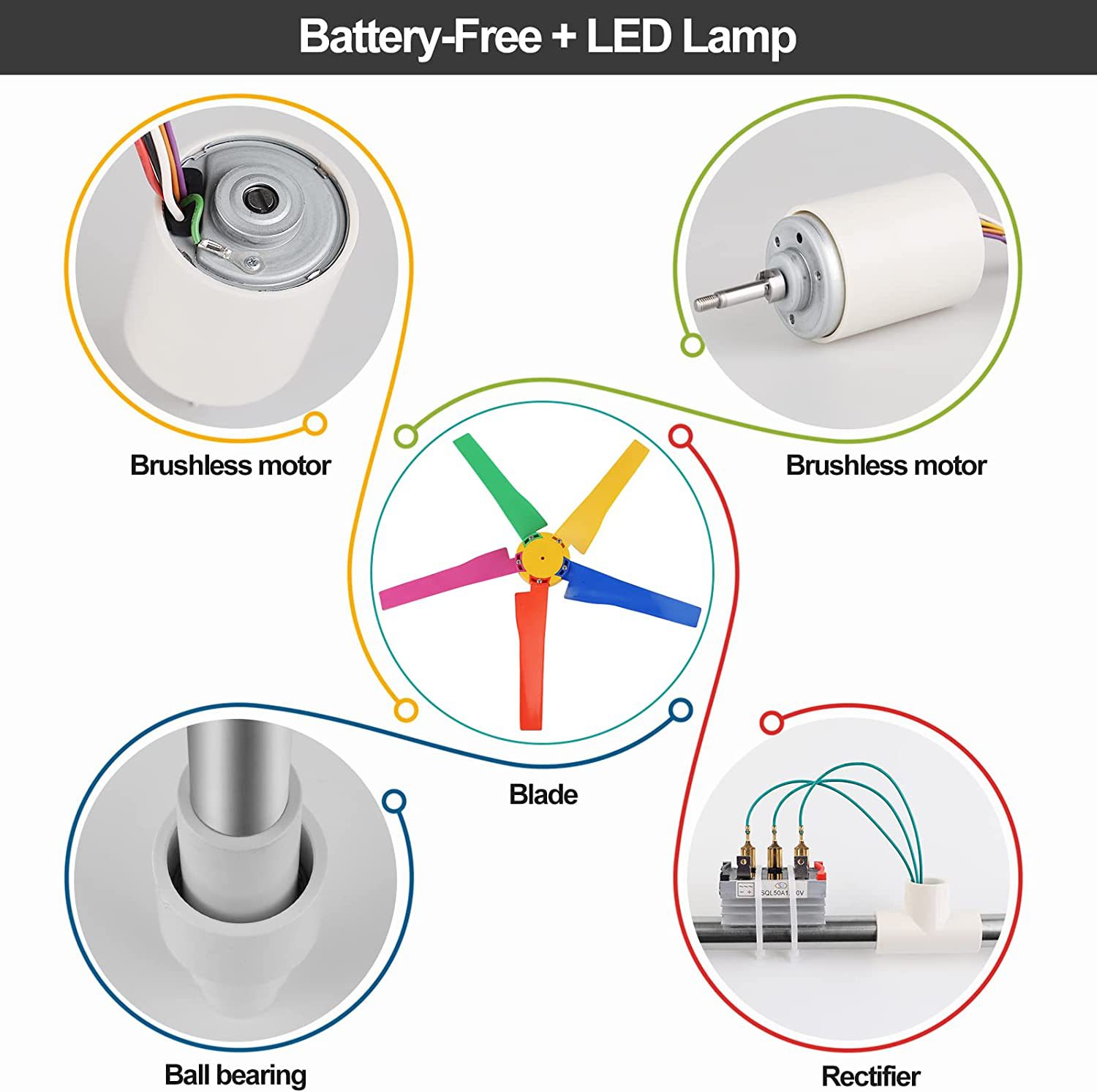 The Colorful blades are made of ageing resistant material ASA/PC. Its physical strength and color change little after 5 years of outdoor use.The support pole is made of 0.9mm thick stainless steel pipe, and the other supports are made of thickened material, making it resistant to strong winds.The tail is designed so that the blades can automatically adapt to the wind direction.
