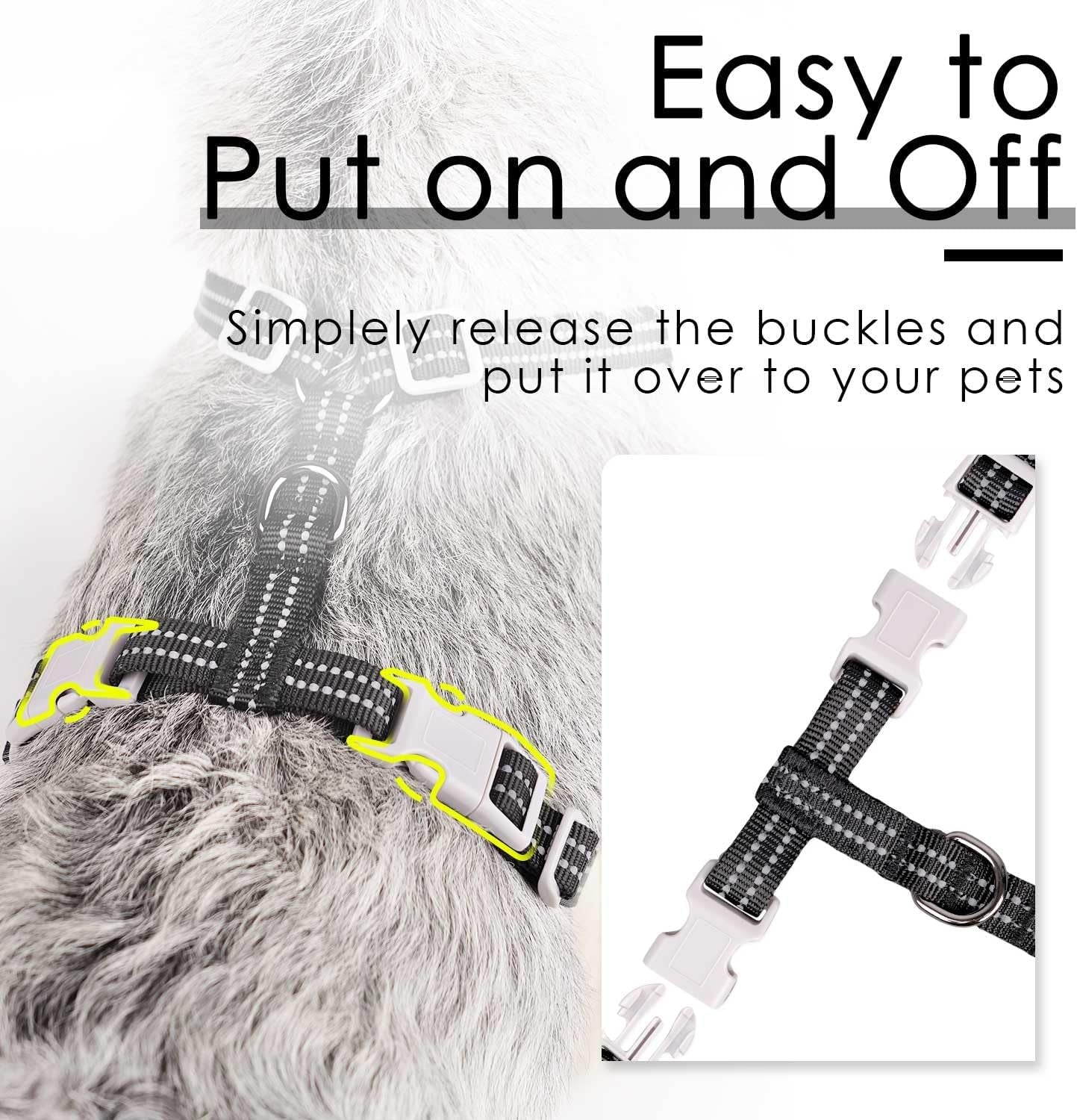 - EASY TO PUT ON AND OFF: The M size medium dog harness first adjusts the sliding straps on the neck and then fits it into the pet's head. Then use two quick release buckles to buckle up the chest, making it easy and convenient to put on and off.
