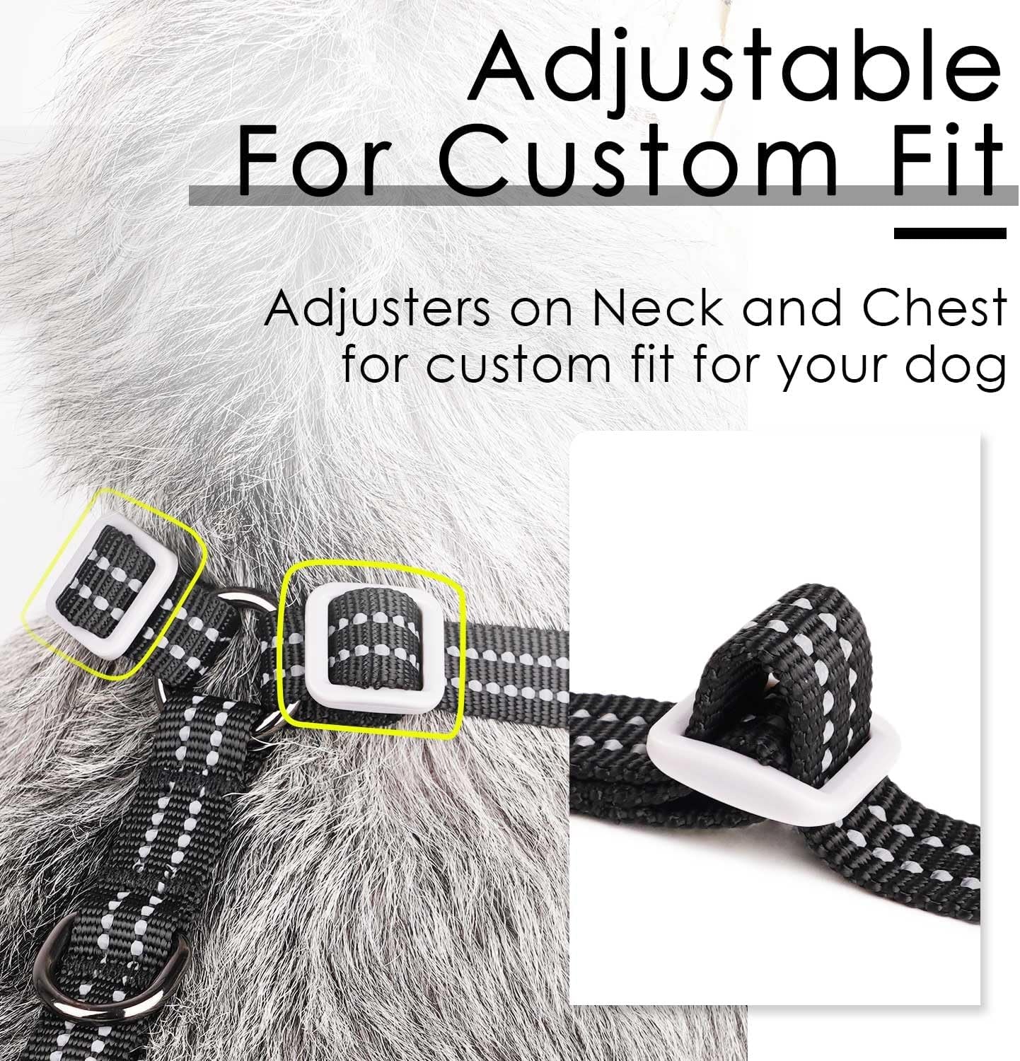 - ADJUSTABLE HARNESS: The Thinkpet's pet vest harness has 4 adjustable sliding straps, and both the neck and chest straps can be used to adjust the tightness, providing your pet with a suitable fit without worrying about falling off or choking. ▲ Please ensure there is space for two fingers between the harness and the pet's body.