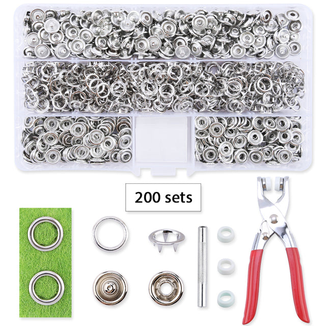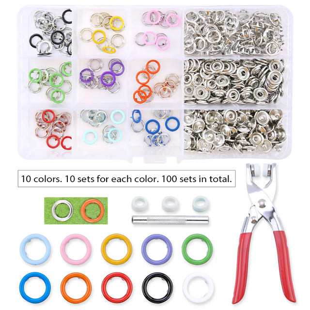 - For each snap set, you will need 1 piece male snap, 1 piece female snap and 2 pieces hollow prong rings.