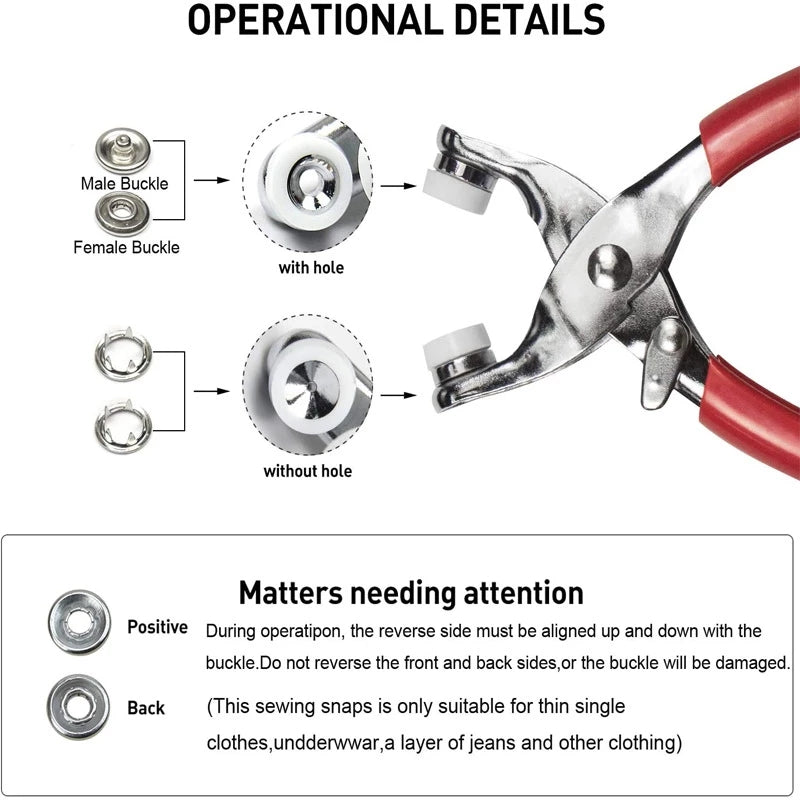- Put the hollow prong rings on the pliers lower side without-hole and the male and female snaps on the pilers' upper side with hole.