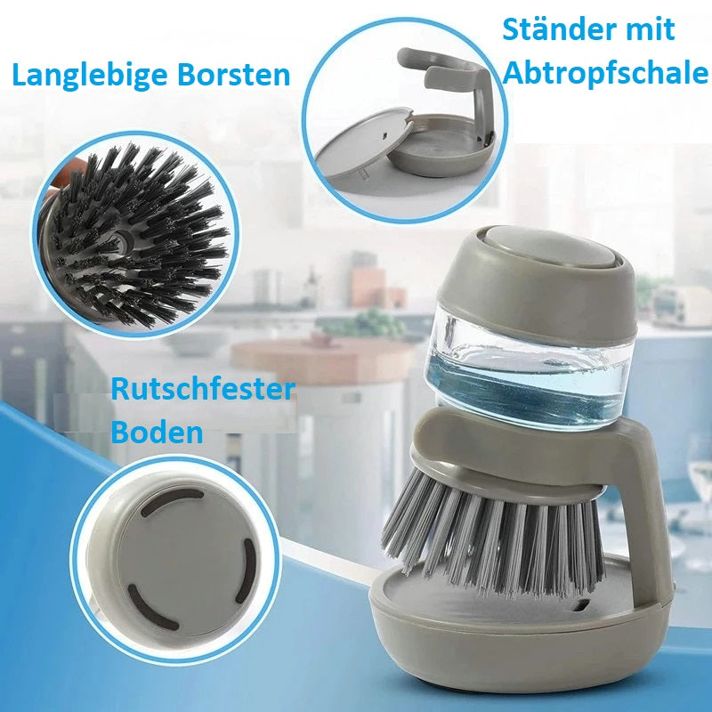 Die Kombination aus Spülbürste und Seifenspender ermöglicht eine schnellere Reinigung des Geschirrs. Du musst nicht mehrmals Seife auf das Geschirr auftragen, da die Seife kontrolliert und gleichmäßig während des Reinigungsvorgangs freigesetzt wird. Somit sparst du dir mehr Zeit!