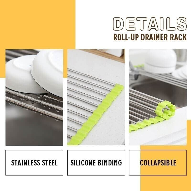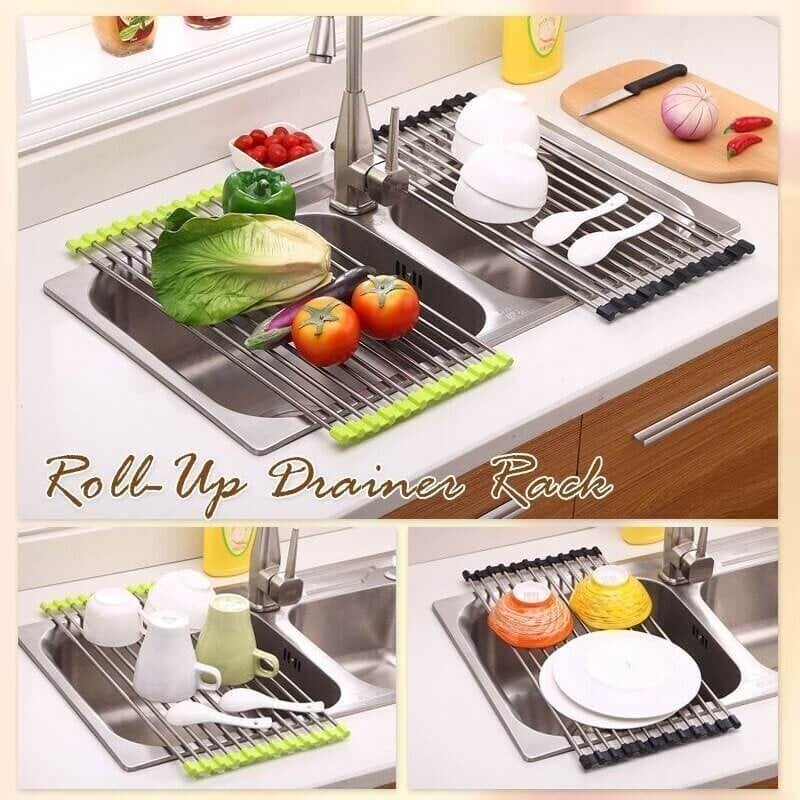 Over the sink dish drainer for air-drying washed bowls, pot, fry pans, tableware, cookware, cutlery, and so on; vegetable colander and prep works platform over the sink. Then roll up and put away (easy to store).