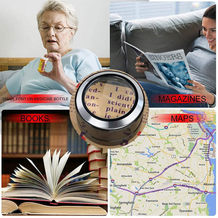 LED Magnifying Glass: with 3 pcs high quality, ultra-bright LED lights, the magnifying glass system also provides extra luminance to ensure an overall better reading experience, which is particularly helpful for people with macular degeneration or far-sightedness/feyopia.