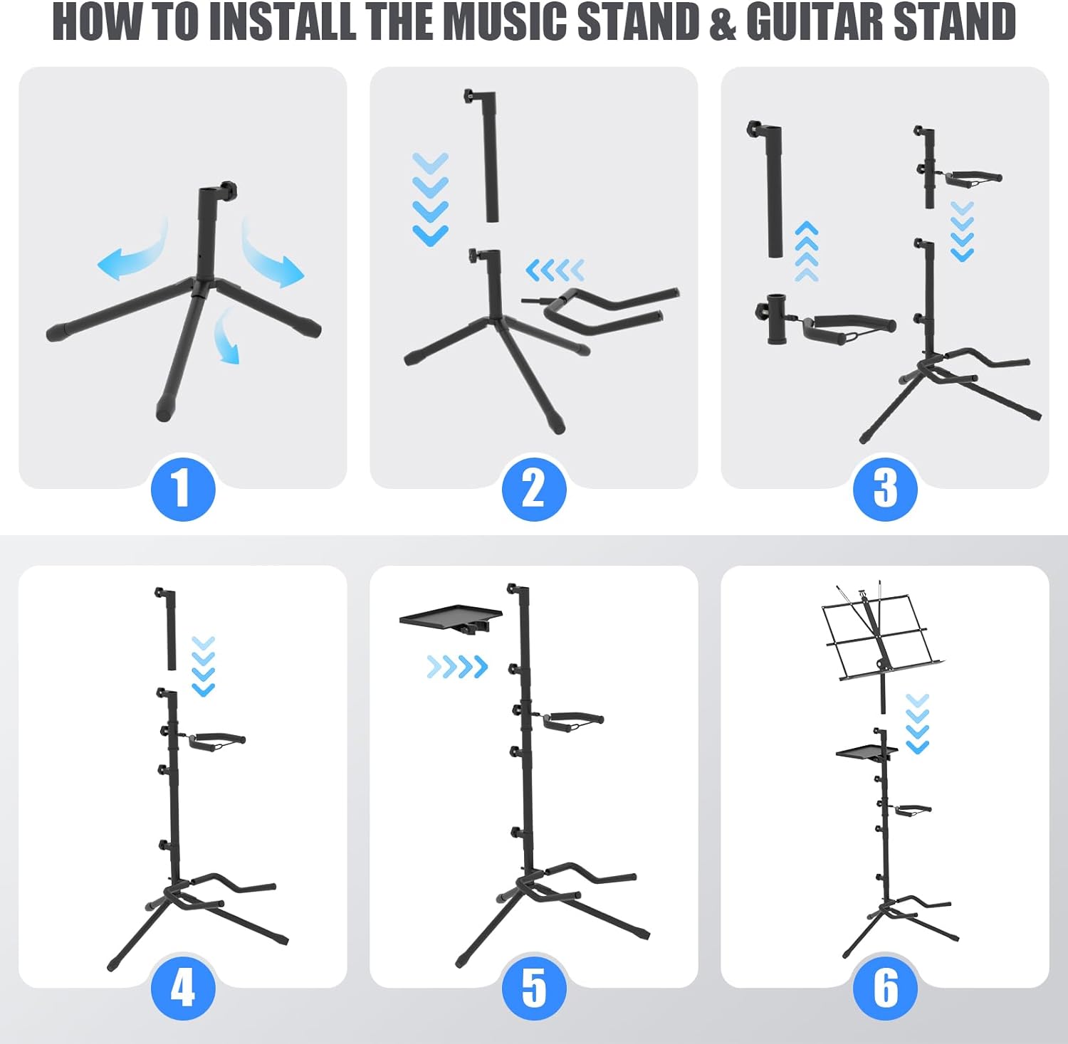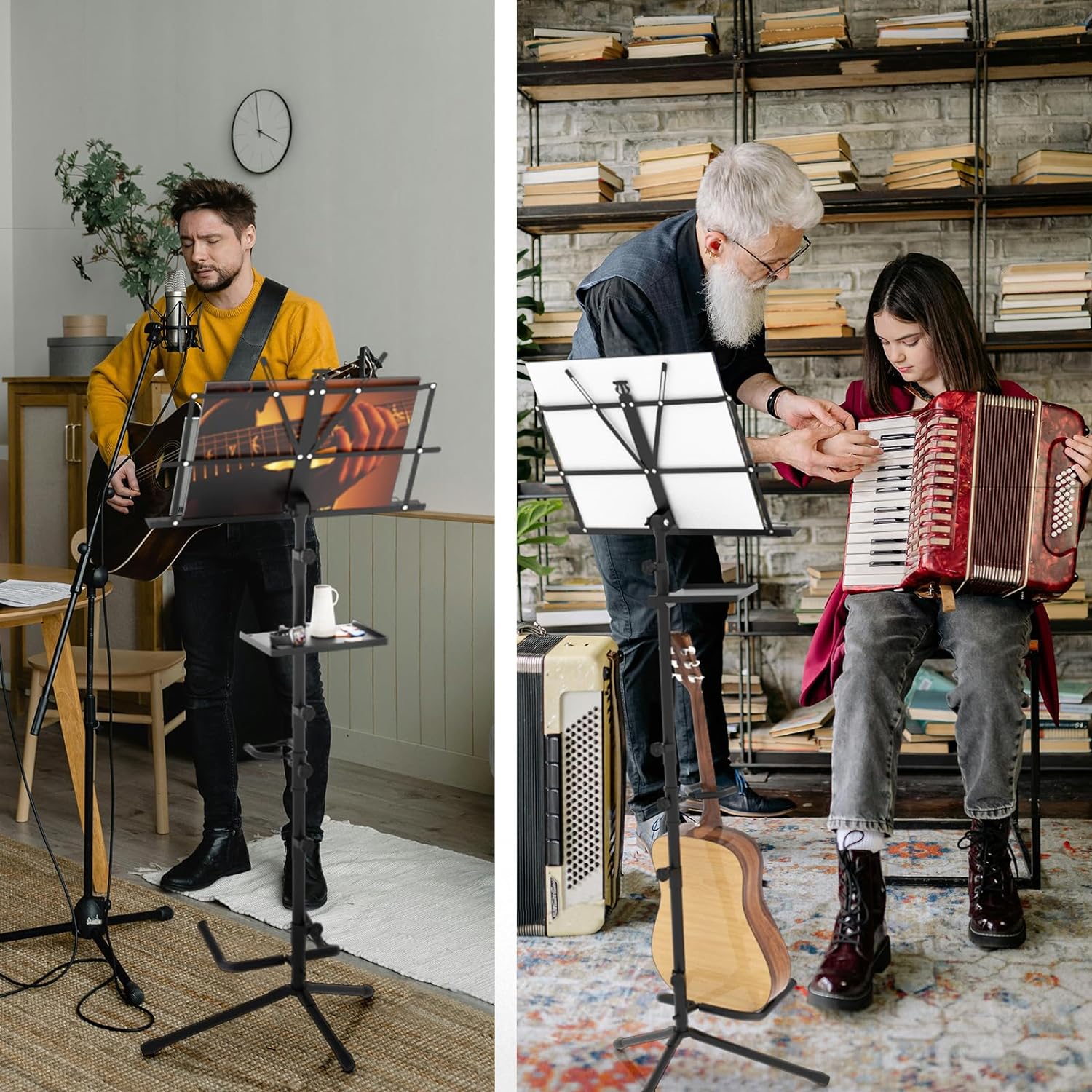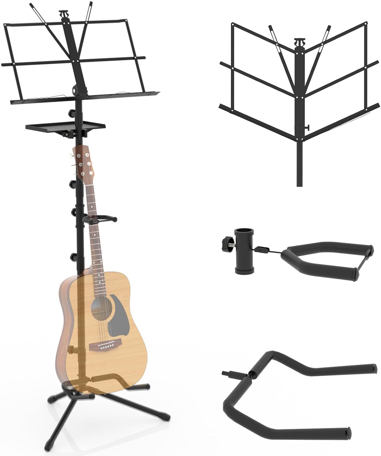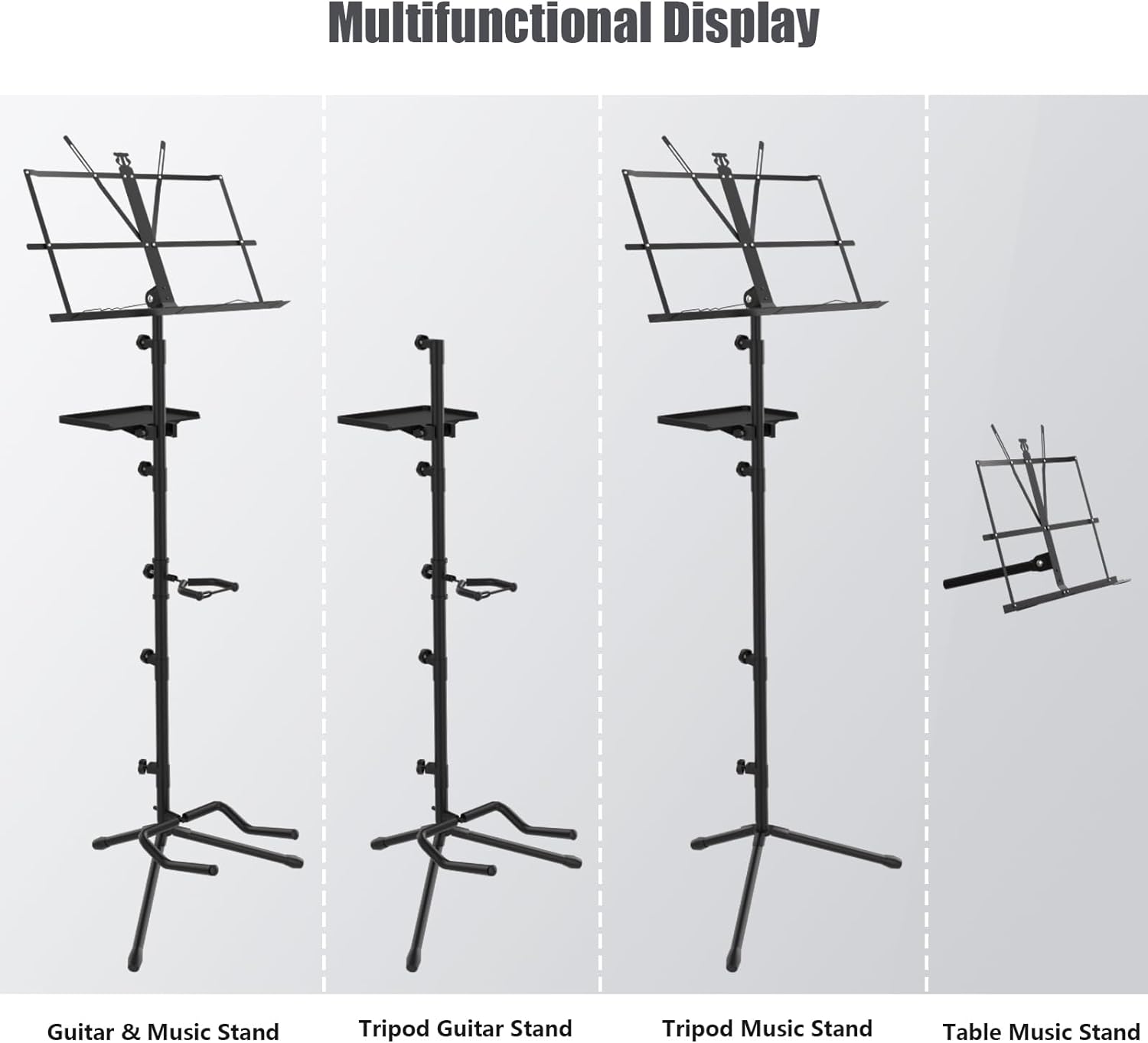 - 📦2 In 1 Dual Use Vertical Music Stand & Guitar Stand Package Includes:Package Includes: Guitar Tripod*1, Music Sheet Clip Holder*1, Clamp-On Rack Tray*1, Guitar Nonslip yoke*1, Guitar Folding Padded Cradle*1, metal Pipe*3. Suitable for schools, orchestras, choirs, church bands, and more!