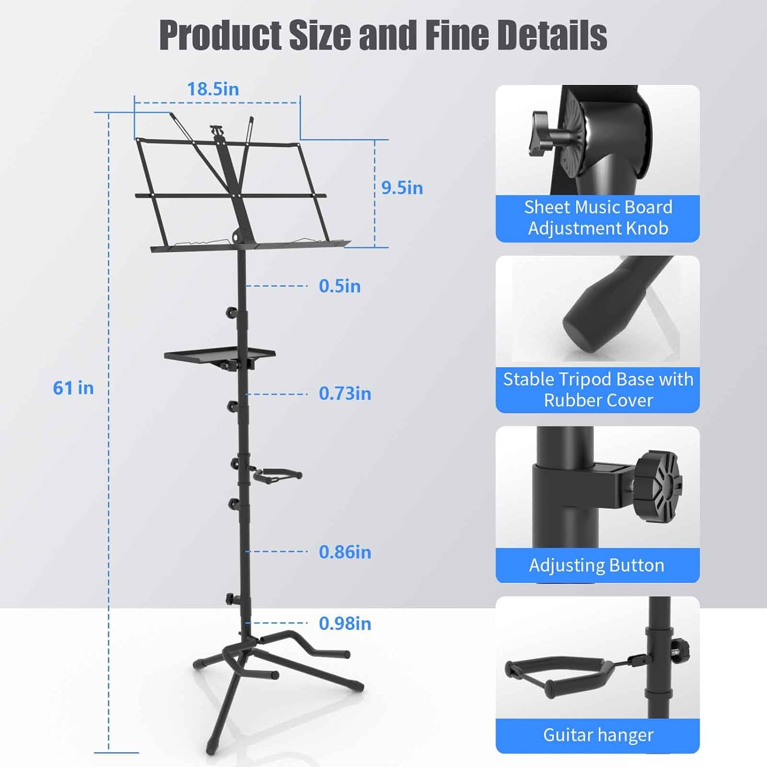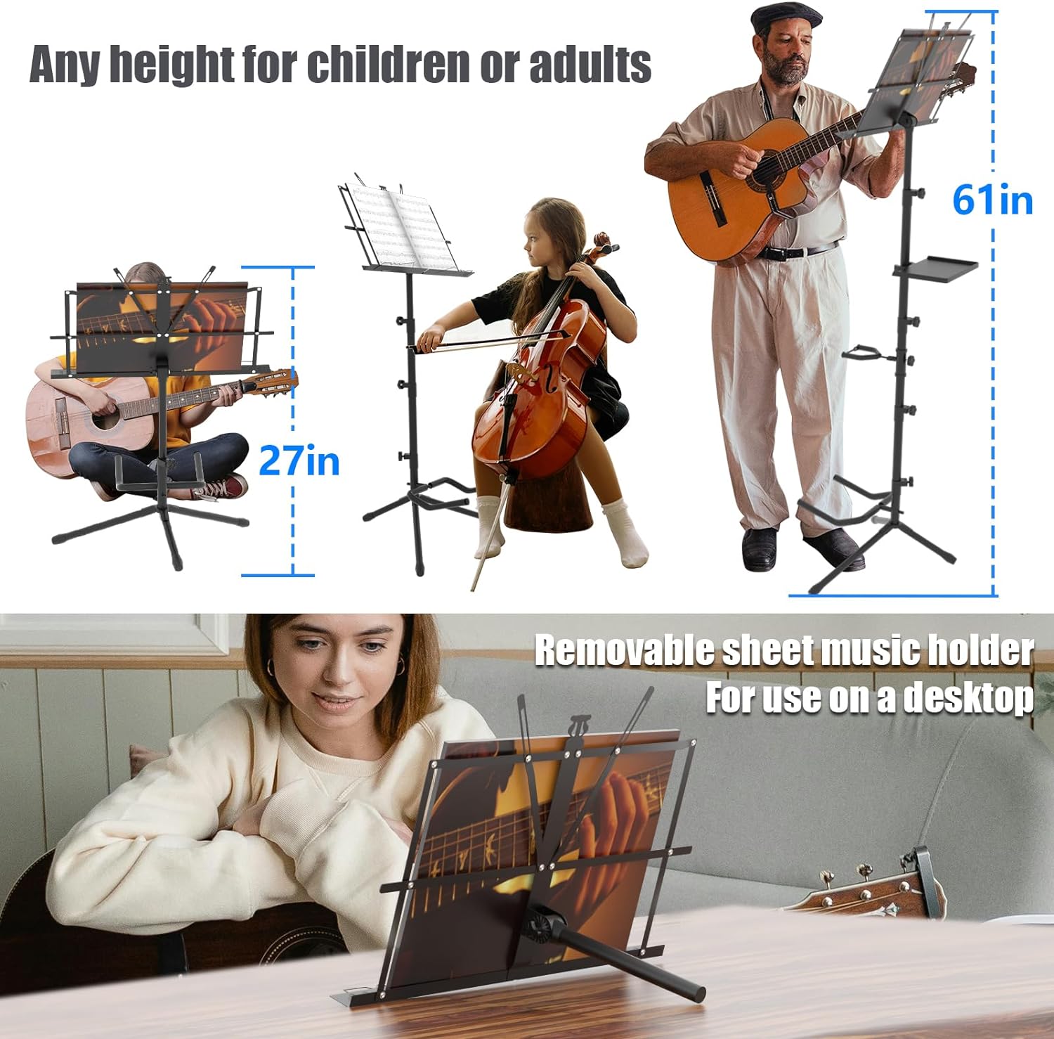 - 🎼Collapsible and Adjustable Height Design:Foldable music book stand and collapsible tripod electric guitar stand for excellent portability and easy storage.Sheet music stand height adjustable from 27 to 61 inches,this stand is very comfortable for users sitting or standing.