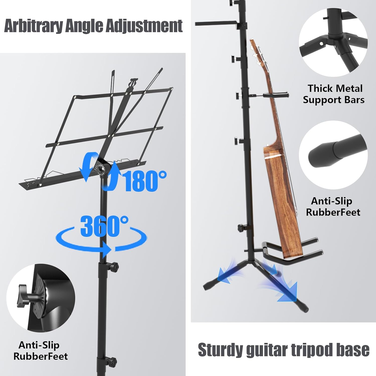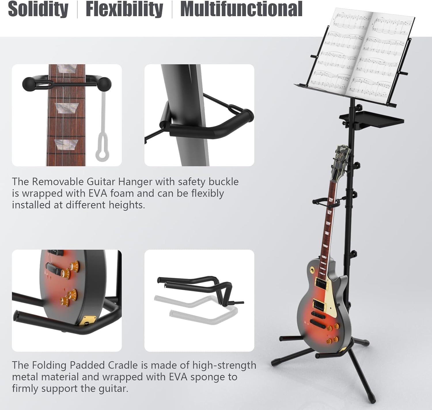 - 🎵Innovative Dual-Function Design: The Guitar Stand & Music Sheet Holder 2-in-1 Dual-Use is a revolutionary product , seamlessly integrating the functionalities of a guitar stand and a music sheet holder. This innovative design enhances the convenience for musicians or music-lover who need both accessories during performances.