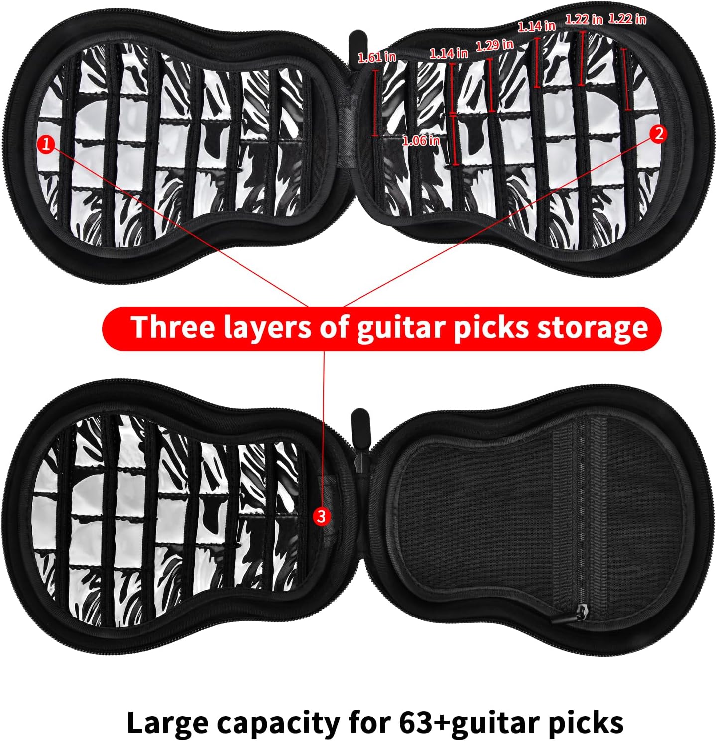 - Guitar pick holde with multiple compartment design: With a double-layer partition design, the pick storage pouch provides three spacious compartments for organizing for fender guitar picks. The additional zippered mesh pocket for dunlop picks storage allows for storing medium guitar picks, thumb picks, strings and guitar accessories, ensuring convenient storage and preventing them from getting lost, ensuring a seamless music creation experience.