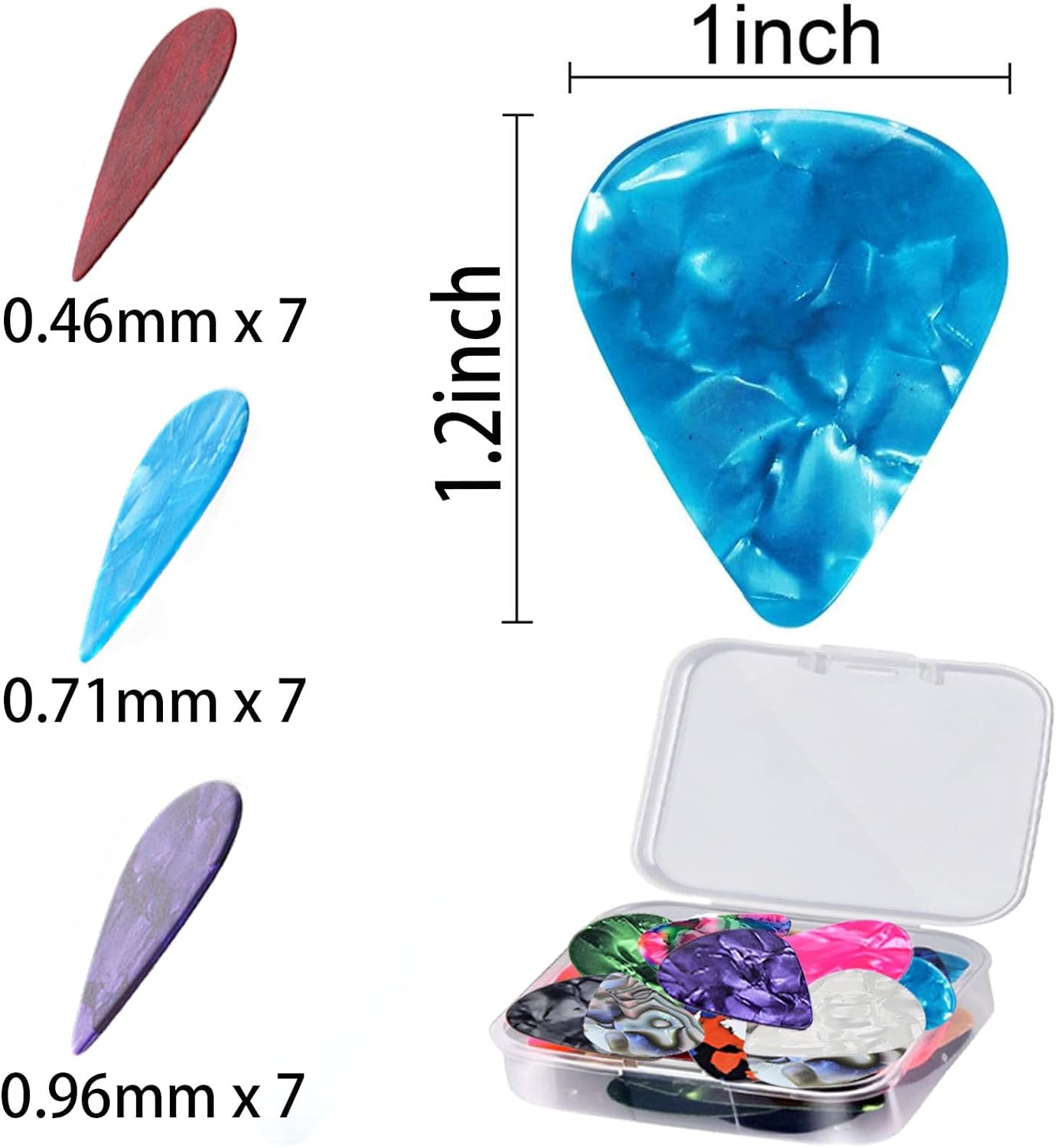 - High Quality: High quality celluloid classic guitar picks provides a natural feel and warm tone for comfortable playing on electric, acoustic, bass guitar, banjo or ukulele. The variety of widths and differing flexibility will suit all styles of music and playing preferences.