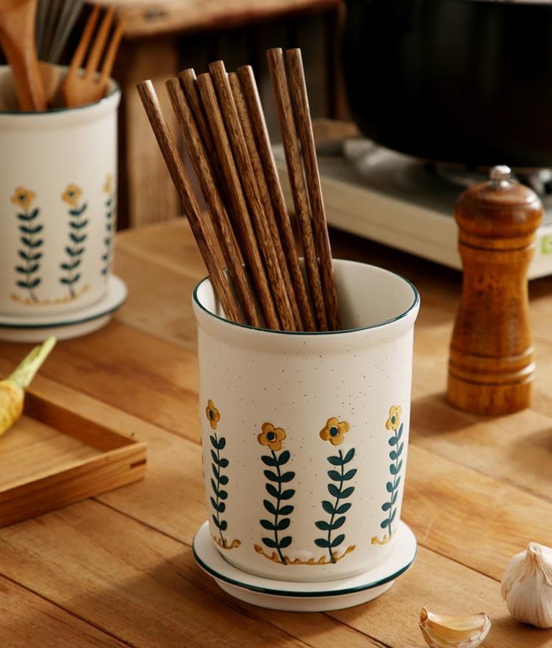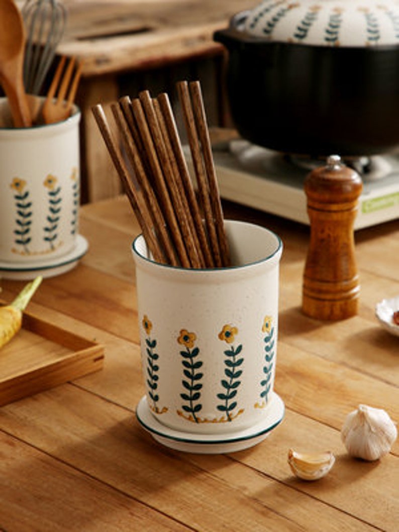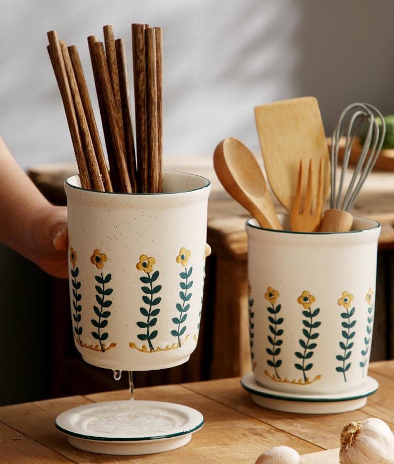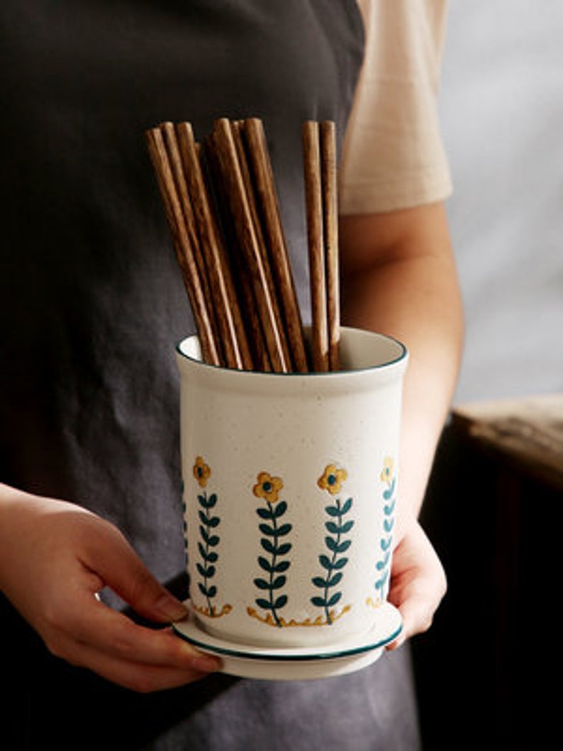 "There are small black spots on the small yellow flower cutlery tube. This is not a defect. This is a unique Japanese sesame glaze. The spout is drawn in dark and light strokes. The small yellow flowers are hand-painted, so there is no guarantee that every chopstick has the same pattern. Large capacity can accommodate more tableware, making your desktop more tidy, separate design, easy to clean with water, ceramic material, no mildew, no deformation, and a water filter hole at the bottom to avoid the growth of bacteria