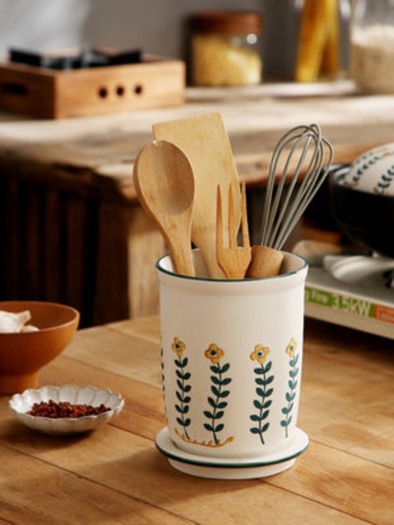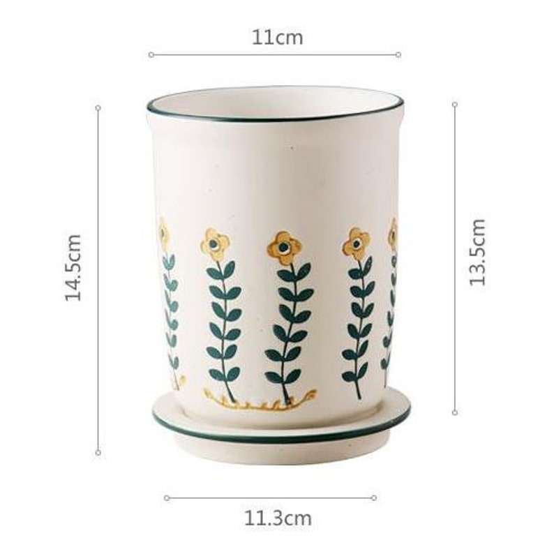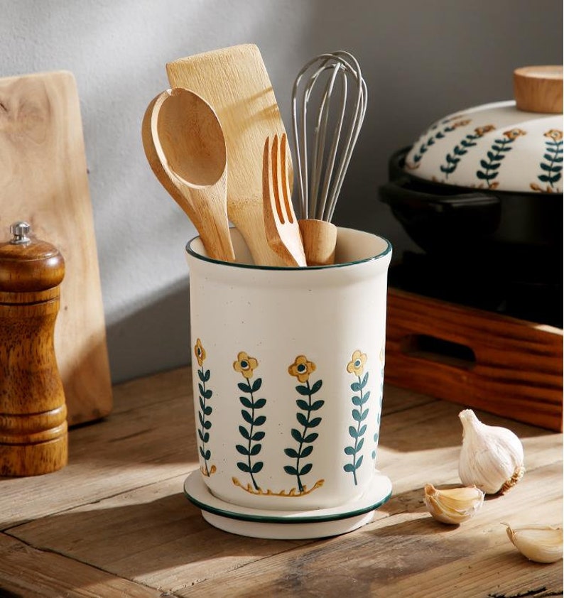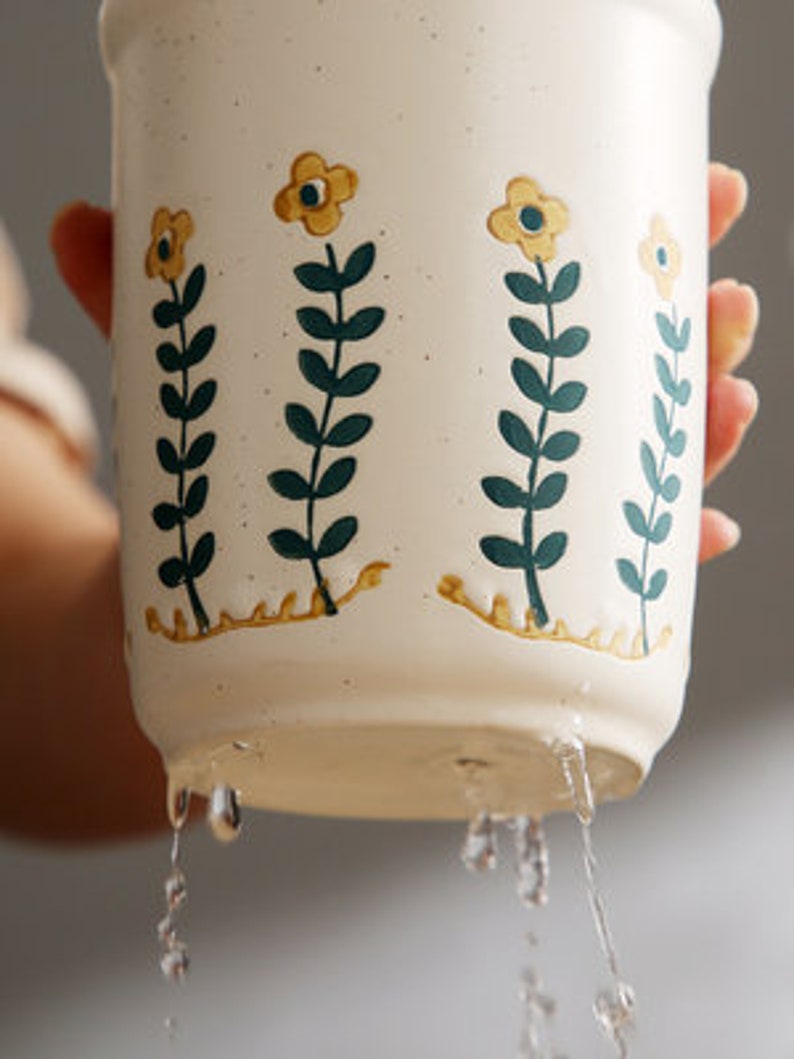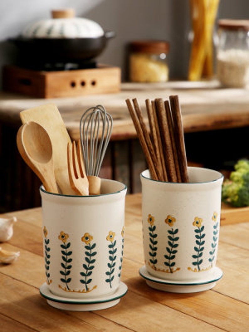 "There are small black spots on the small yellow flower cutlery tube. This is not a defect. This is a unique Japanese sesame glaze. The spout is drawn in dark and light strokes. The small yellow flowers are hand-painted, so there is no guarantee that every chopstick has the same pattern. Large capacity can accommodate more tableware, making your desktop more tidy, separate design, easy to clean with water, ceramic material, no mildew, no deformation, and a water filter hole at the bottom to avoid the growth of bacteria