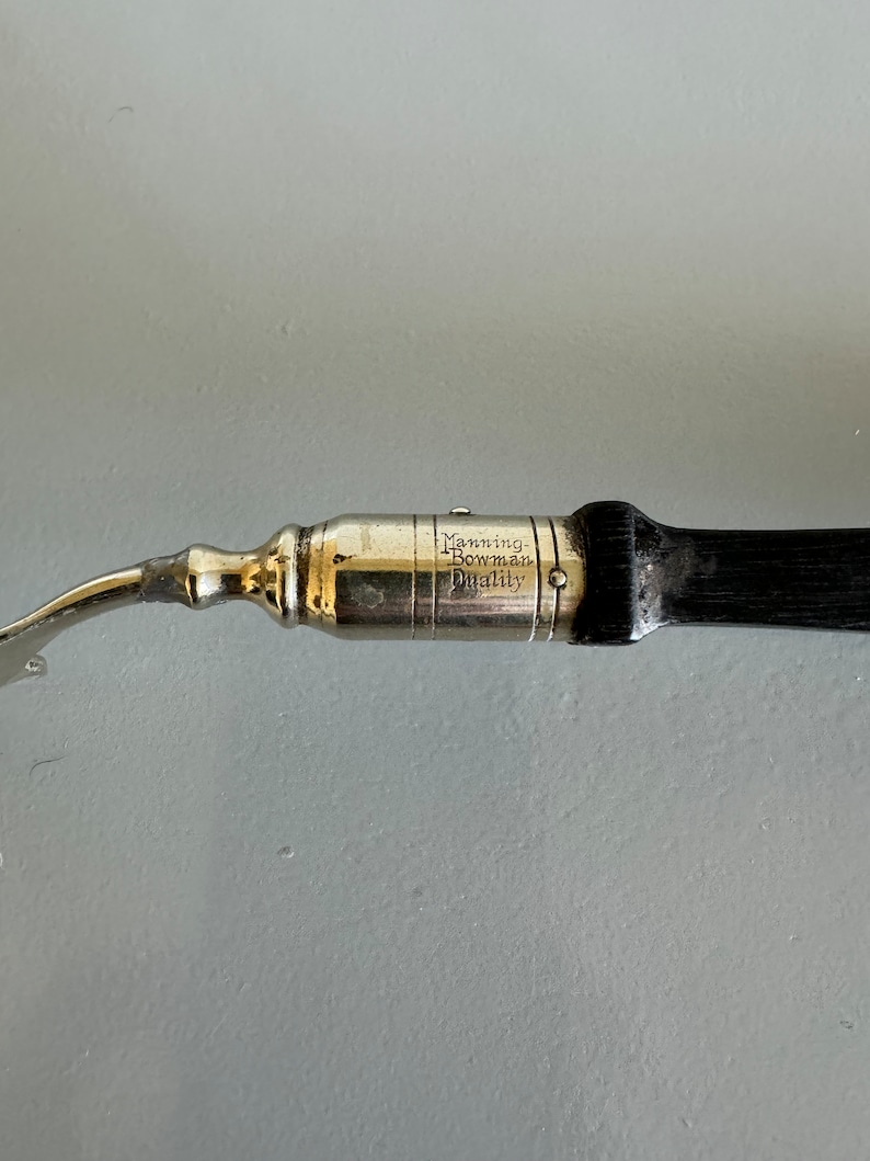 These vintage serving pieces are made by Manning & Bowman- founded in 1832 in Connecticut. Made of silver plate with wood handles, each piece includes the company mark, "Manning Bowman Quality" on the back.