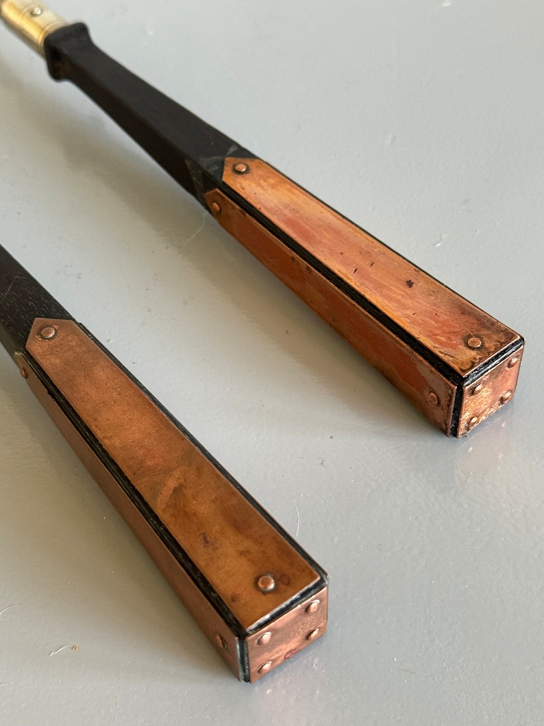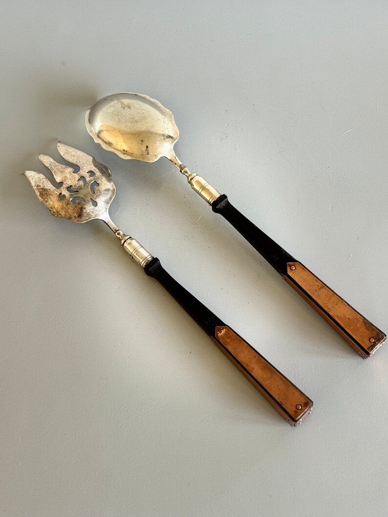 I especially love the contrast of the silverplate with the ebony wood handles. This is a rare style with the copper detailing on the handles.